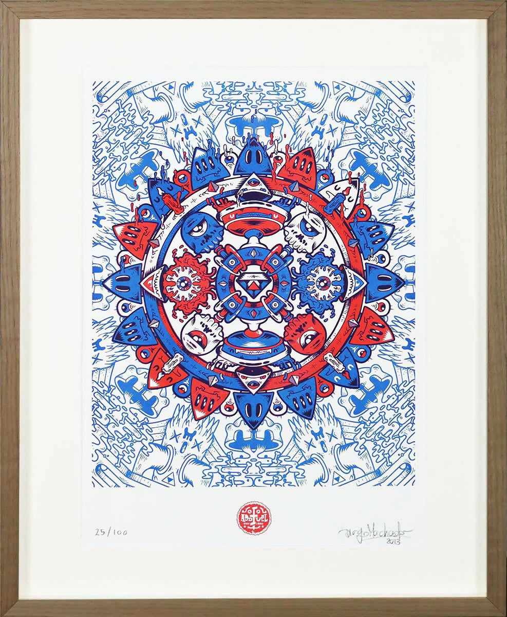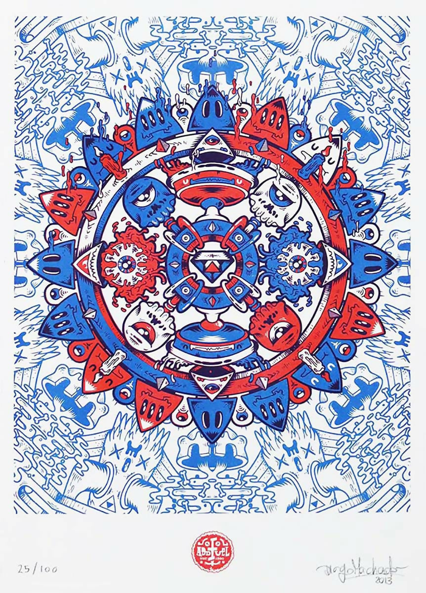 Der portugiesische visuelle Künstler und Illustrator, Diogo Machado (1980) künstlerisch von Add Fuel, absolviert im Grafikdesign von IADE - Institut für Bildende Kunst, Design und Marketing von Lissabon. Seit 2007 konzentrierte er sich ausschließlich auf sein Kunstwerk, wodurch ein dunkles, aber üppiges, aber üppiges visuelles Universum schaffte, das von einer Besetzung von viskosen, exzentrischen und fröhlichen Kreaturen bewohnt wurde, beeinflusst von einer Vielzahl von Interessen, die von Videospielen bis zur Animation reichen, die durch Filme mit niedrigem Budget und städtische visuelle Kultur. Anschließend begann er aufgrund seiner Faszination für die ästhetischen Möglichkeiten symmetrischer Standards an der Neuinterpretation der Sprache des traditionellen Designs der Fliesen und insbesondere der portugiesischen Fliesen der emaillierten Keramiken. Erkundung einer großen Auswahl an manuellen und digitalen Techniken in den Bereichen Zeichnen, Malerei, Keramik und Drucken drückt seine Praxis einen anspruchsvollen Dialog zwischen dem Alten und dem neuen, zwischen Erbe und Modernität aus. Neben den zahlreichen künstlerischen Interventionen im öffentlichen Raum hat sie auch ihre Arbeit in einzelnen und kollektiven Ausstellungen in Galerien wie Underdogs Gallery, Saatchi Gallery, Pure Evil Gallery, unter anderem präsentiert.