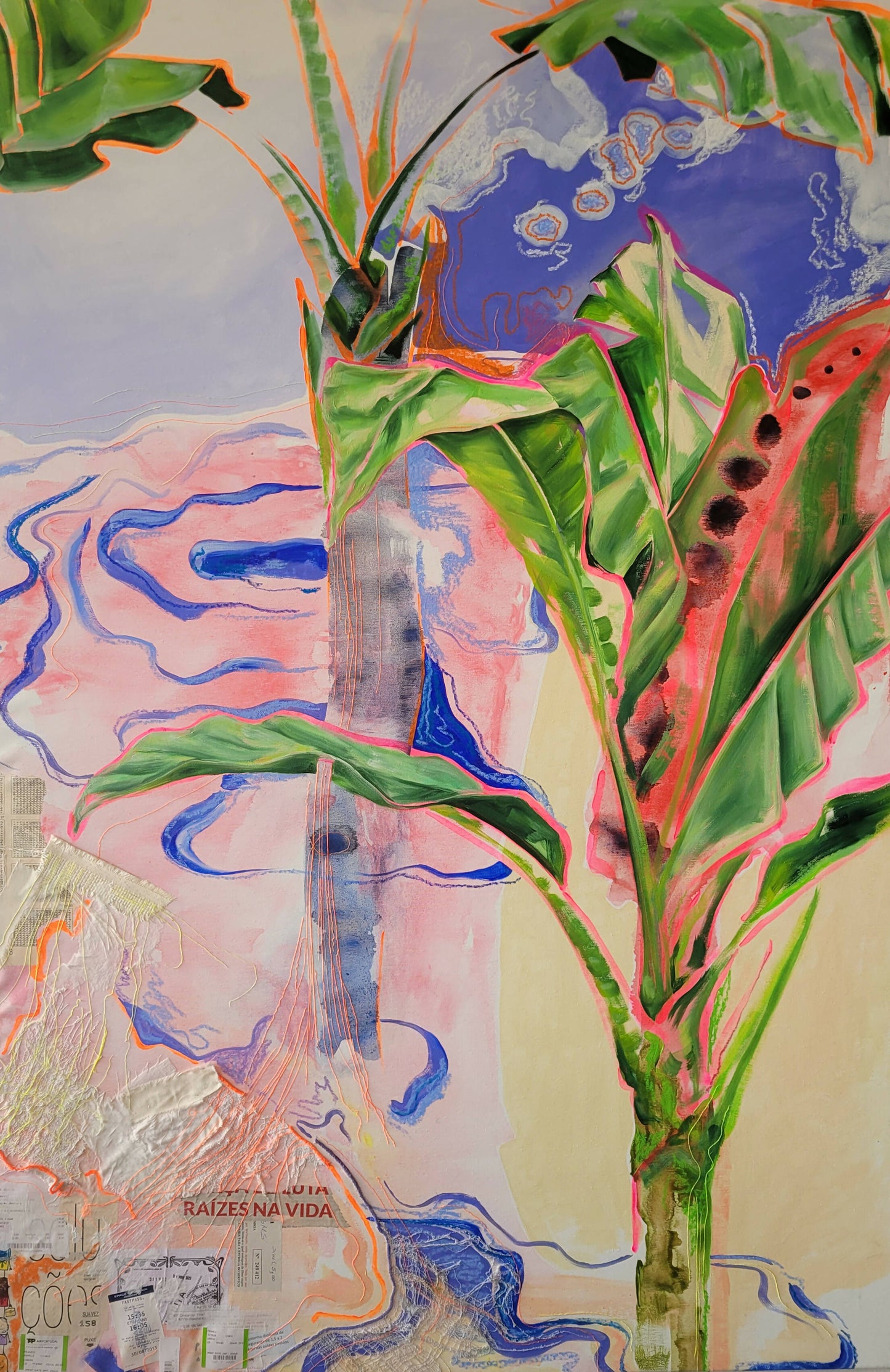 „Die Arbeit Ida e Volta entstand aus einer Reise in die Vergangenheit, bei der ich ohne vorgefasste Meinung erforschte, was passiert, wenn ich Tinte auf Papier gieße. Ich habe versucht, diese Farbkomposition für die Leinwand nachzubilden und daraus ein Bild zu erstellen.“ Das nutzt die ursprüngliche Essenz und ermöglicht eine Reise zurück zu meinem dreijährigen Ich, wodurch ein Wachstumsfaden entsteht. Auch durch Collagen habe ich versucht, Erinnerungen zu verewigen. Diese Arbeit ermöglichte es mir, wieder ein Mensch zu sein Kind und malen, ohne das zu haben. Ich habe keine Ahnung, wohin ich gehen soll oder was ich am Ende des Gemäldes haben werde.