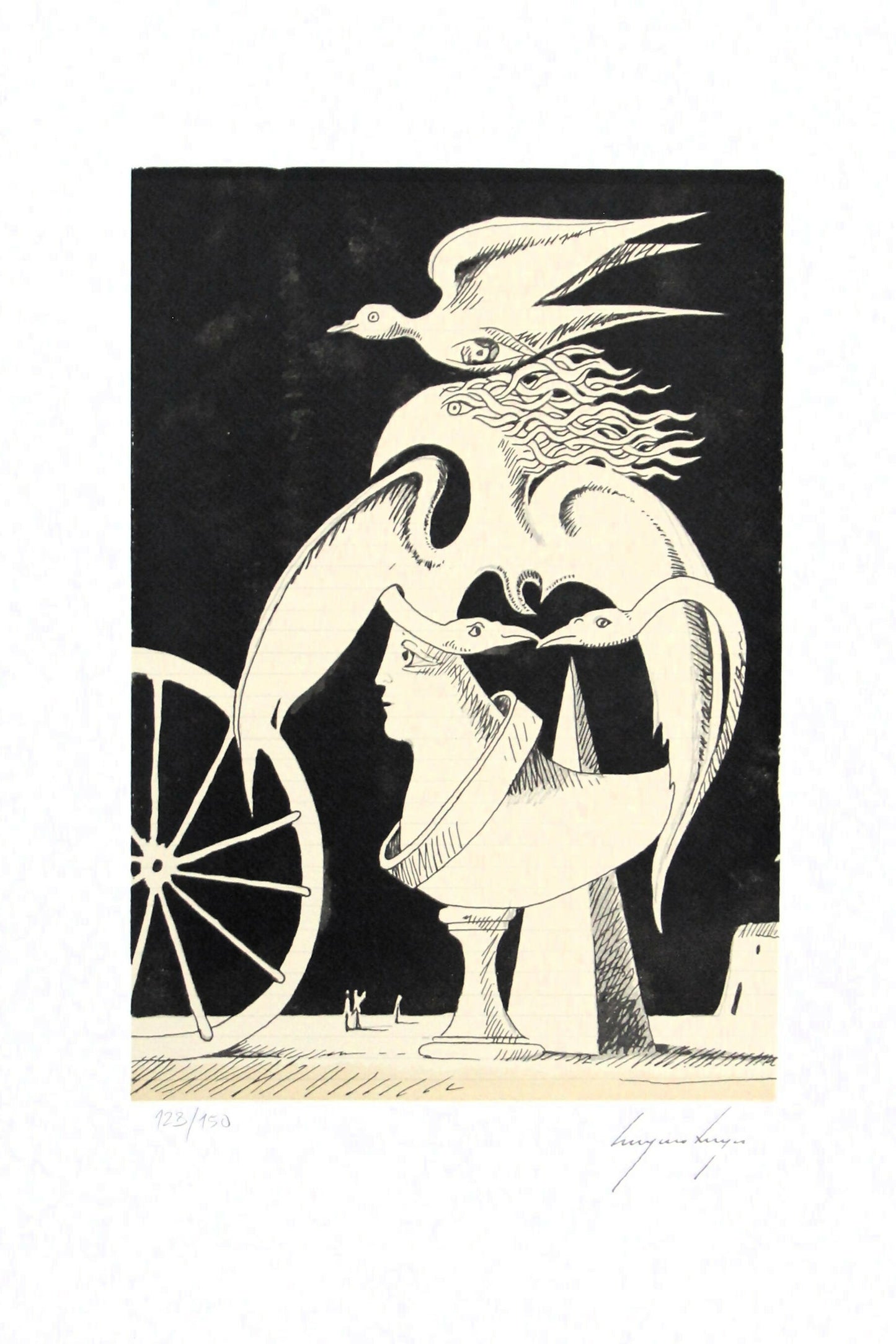 Der portugiesische Künstler Cruzeiro Seixas (1920-2020) ist einer der großen Namen des Surrealismus in Portugal. In seinem umfangreichen künstlerischen Schaffen durchlief er mehrere Phasen, vom Expressionismus über den Neorealismus bis hin zum Surrealismus. Er erforschte verschiedene Techniken und Hilfsmittel und vermittelte so eine ständige poetische und plastische Freiheit. Zu seinen Zeichnungen, Gemälden und Skulpturen gehörten die metaphysischen Landschaften von Giorgio de Chirico und die metamorphen Figurationen von Salvador Dali. Durch die Kontraste zwischen Schwarz und Weiß entwickelte er ein ganz persönliches Fantasieuniversum. Er träumte und imaginierte, ohne ästhetische oder moralische Zwänge, in der Welt der bildenden Kunst, aber auch der Poesie. Er war ein häufiger Förderer der surrealistischen Ästhetik in Portugal.