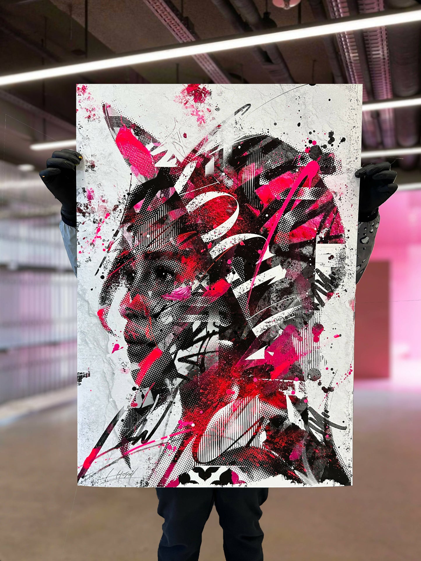 Arbeit auf Papier, vom Künstler von Hand mit Acryl- und Sprühfarbe bearbeitet.