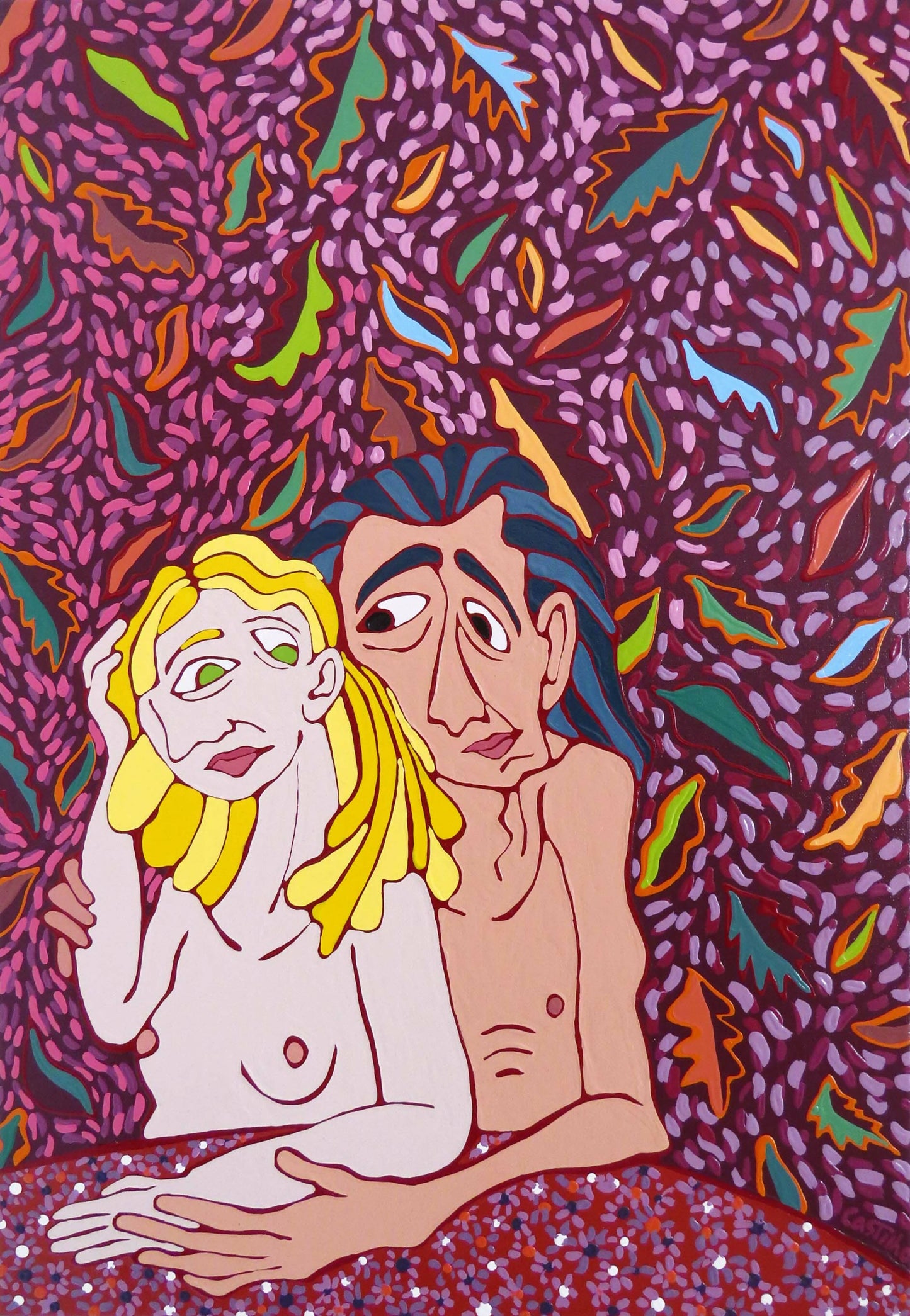 Hugo Castilho creates an intimate universe, by combining his taste for fantasy and line drawing. Based on the surface, the drawing, modeled and painted, emerges as a three-dimensional work. At this meeting, life is celebrated in an inclusive, ethical and humorous way, by embracing humans, animals and nature as vehicles of figurative expression. Hugo Castilho was born in Setúbal in 1995, graduated in Visual Arts - Multimedia variant in 2016, at the University of Évora and, in 2021, completed a Master's degree in Painting at the Faculty of Fine Arts of the University of Lisbon. He exhibited his artistic work individually in 2017 and 2019 at the Espaço das Artes of the Casa da Cultura de Setúbal, and in 2022 at the Arte Periférica Gallery at the Centro Cultural de Belém. Collectively he exhibited at the Zetgallery in Braga in 2019, and at the Drawing Room Lisboa at Sociedade National Museum of Fine Arts in 2021, represented by Galeria Arte Periférica. Currently, he is focused on producing high-relief paintings and writing non-fiction novels.