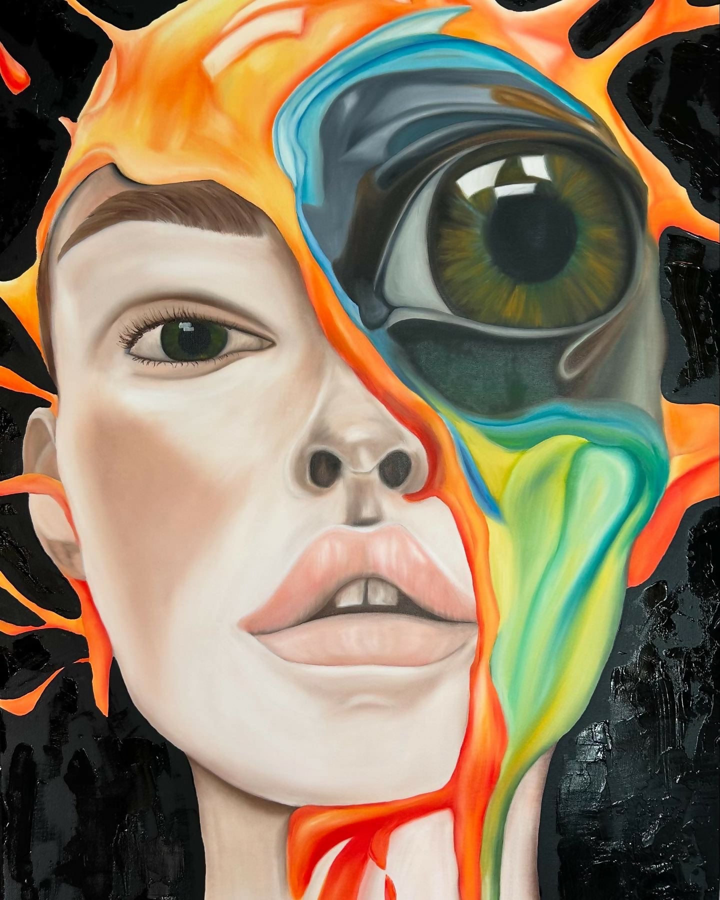 "El Ojo Absorbente". La piel suave y realista se ve interrumpida por ríos de vibrantes colores —amarillos, verdes, naranjas— que fluyen, arden y disuelven los límites. El fondo negro texturizado amplifica el impacto, como un vacío que lo consume todo excepto la esencia de la figura.