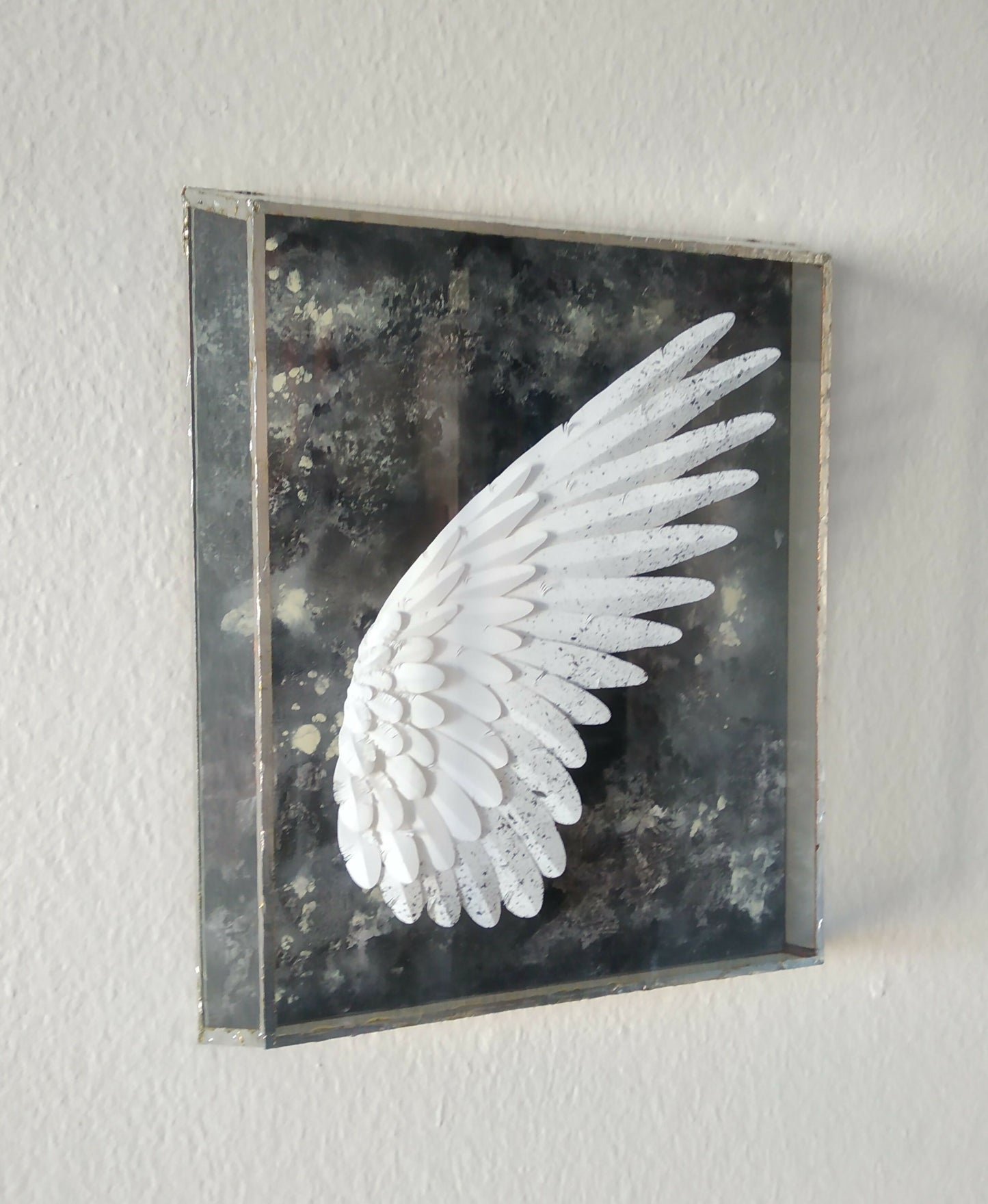 Papel sobre bandeja de madera pintada con acrílico y acuarela, en caja de vidrio soldada a mano.