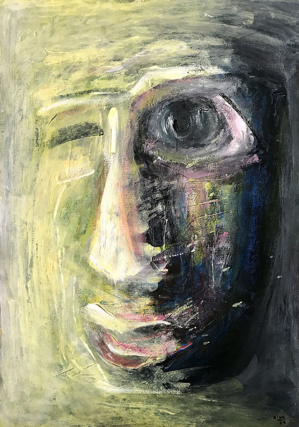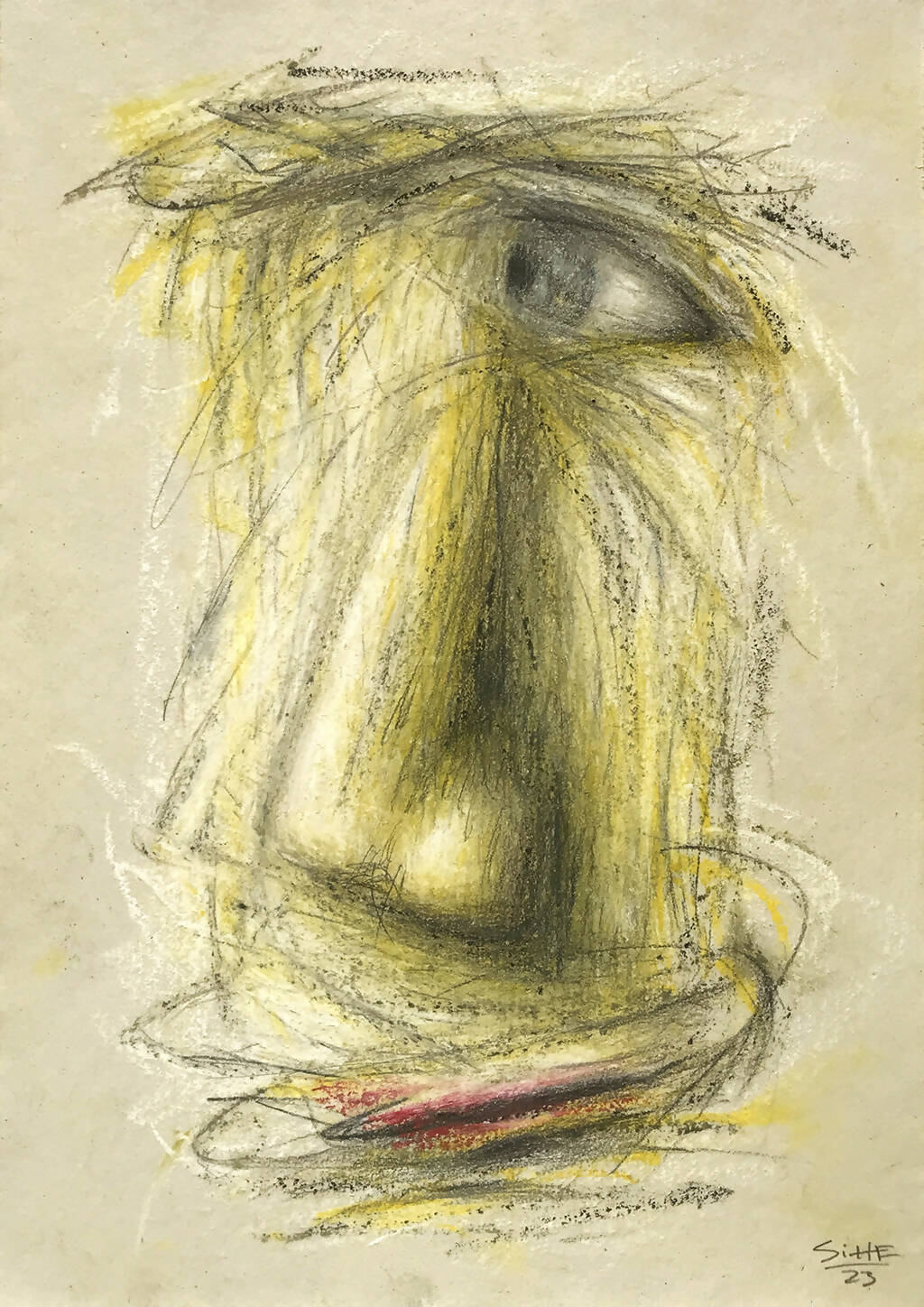 Carboncillo, pastel seco, pastel al óleo y barniz acrílico sobre papel reciclado