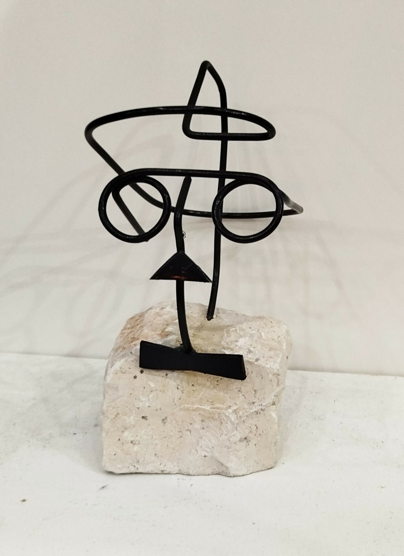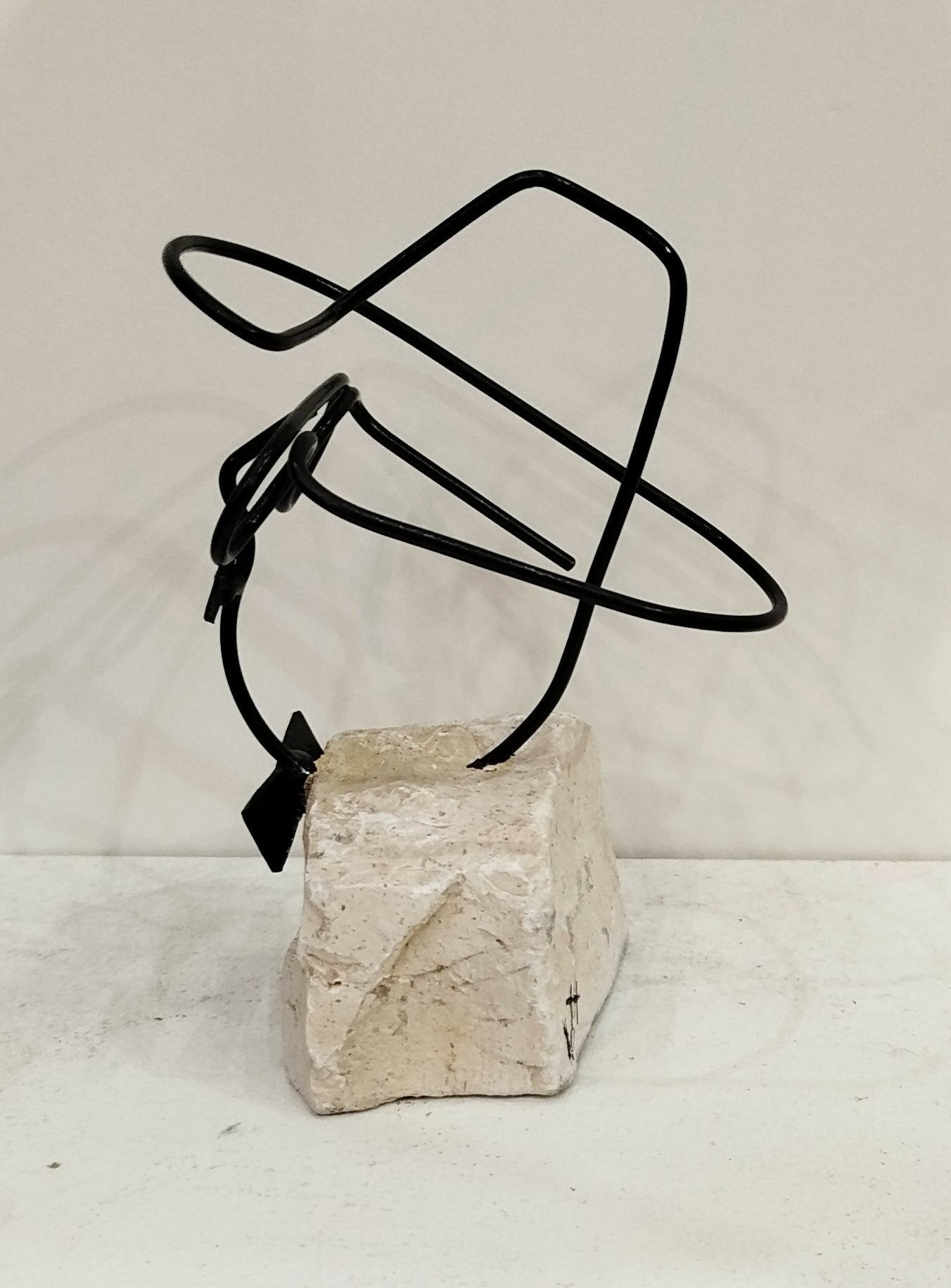 Escultura en piedra caliza blanca y hierro.